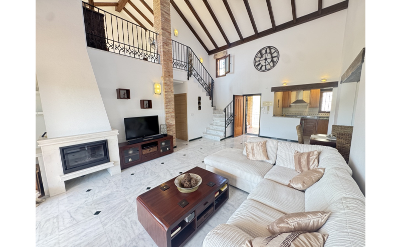 - Large open-plan living area, with high wooden beamed ceiling and plenty of natural light